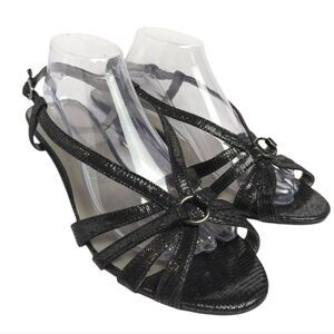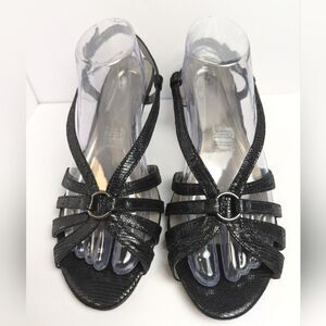 Chic black sandals with stylish straps and O-ring with metallic reptile textile upper. Ideal for a dressy event. Comfortable and fashionable. Low 2.5" heels.