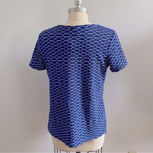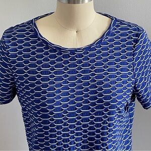 This stylish top features a classic blue and white color scheme, perfect for versatile wear. Crafted with attention to detail, it offers both comfort and sophistication for various occasions. Ideal for casual outings or professional settings. Fabric is stretchy. Crewneck. Short sleeve. Great for layering!