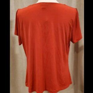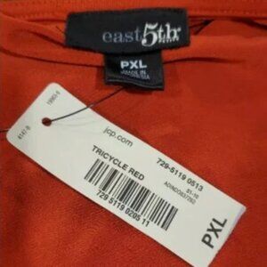 East 5th Petite brand. Red v-neck short sleeve blouse. Color labeled as "tricycle red". New with tags. Size petite extra large. Soft flattering drape. Subtle gold metal trim at neck. I am offering the same shirt in blue in my listings. Ships fast from smoke free pet free home.