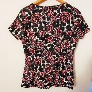 Black and Pink Rose Print V-Neck Blouse in Size Medium by East 5th.