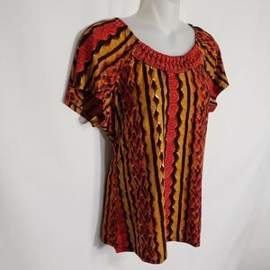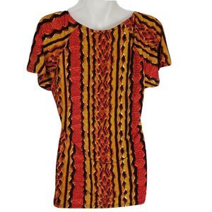East 5th Women Top Size Medium Stretch Short Sleeve Gold Orange Chevron Pullover