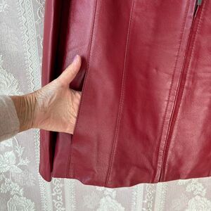 Vintage darker red leather jacket with zipper closure, featuring a stylish and edgy vibe. Brand is East 5th. Excellent condition.