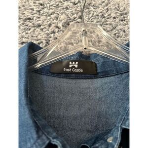 Keywords: East Castle, denim dress, casual dress, knee-length, blue dress, collared neckline, cap sleeves, button-up, pockets, spring fashion, women's fashion, machine washable, pre-owned.