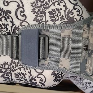 3 front zippered pockets, wide adjustable strap, slip pockets, elastic pocket holders, bungee pull cord, quick release harness clip, back padded media pocket, elastic strap holders
