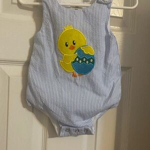 Adorable blue and white striped bubble romper Front has yellow chick with an Easter egg Wore one time Size 6 months Smoke free home