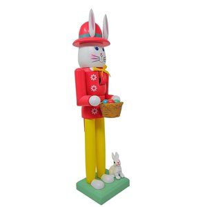 This 15" wood bunny nutcracker wearing a pinkish outfit with yellow pants and matching hat. The rabbit is holding a basket of Easter eggs