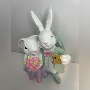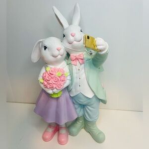 Charming bunny couple figurine. Features pastel colors. Bunny holding a bouquet. Perfect for home decor.