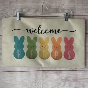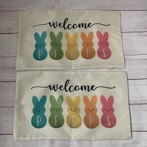 Multi-color Easter rabbit pillowcases with the word WELCOME in black script and PEEPS across the colorful bunnies. Set of 2 pillow covers. Print is on one side only. Back is blank. Zipper opening for stuffing or cushion. PILLOW NOT INCLUDED. New, never used, but without tags. Very light variation in color or a couple of spots on the back of one case.