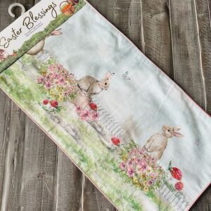 NWT beautiful soft fabric beaded Easter bunny rabbit floral mushroom scenic graphic spring table runner decor. 14”x56”.