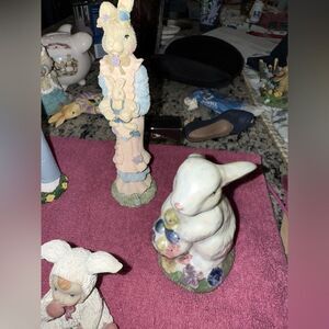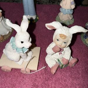 Charming Easter bunny figurine collection. Features various bunnies in playful poses. Perfect for holiday decor.