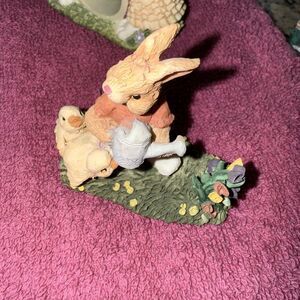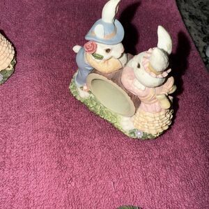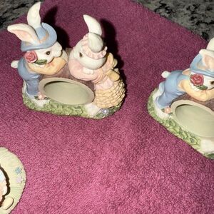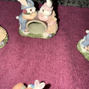Charming Easter bunny figurine set. Features pastel colors and adorable designs. Perfect for holiday decor.
