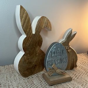 Easter decor set of 3. Large bunny 12” h x 6”w, small bunny 8”h x 4” w, metal egg 6.25”h x 4” w