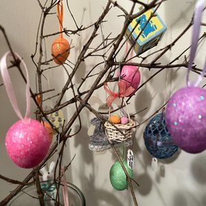 retail ornaments, 11 glittering eggs, oval basket. Start a new Easter