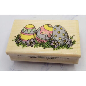Add a touch of rustic charm to your Easter card creations with the Uptown Rubber Stamps Wood Mounted Stamp, model HH-13193. Featuring a delicate Easter eggs in field design, this stamp is perfect for crafting backgrounds that bring your holiday themes to life.
