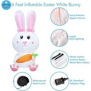 6 feet Inflatable Bunny is the best way to spread cheer this Easter Season! Featuring inner lights to gently illuminate its effects at night. Our inflatable package includes rope, stakes, and a powerful blower fan to allow for a quick and easy setup. Easter can be one of the most memorable Holidays for any child or adult.
