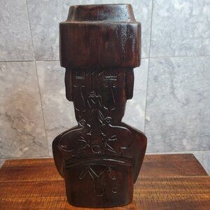 Easter Island, Rapa Nui, Hand-Carved Wooden Moai 15" , with Glyphs on Back, statue measures 15" H x 7.5" W x 4" D, very good condition. This item was purchased from a local artisan on Easter Island, located in the middle of the South Pacific Ocean. The Moai that are memorialized by this wooden sculpture are the main reason why tourists flock to Easter Island a/k/a Isla de Pascua.
