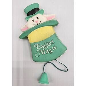 1980s Mint green and yellow painted plastic novelty pin. Measures 2.25 inches wide by 2 inches high (just over 3 inches when Mr. Bunny pops up). String hangs down an additional 2.5 inches. Great mechanical condition with no chips or scratches but has a little dirt (see photos).