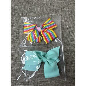 An Easter themed set featuring a soft yellow plush bunny, playful hair bows, a colorful beaded bracelet, and a vibrant striped marble bouncy ball.