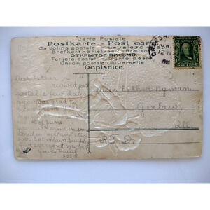 Posted with cancel. Series 443 on front. Gold gilded accents. Antique original vintage embossed post card. Has writing on front, rounded corners, and age wear. Stock #eas222.