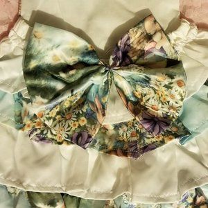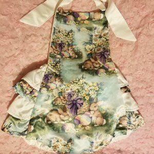 Satin fabric with Easter Bunnies and Daisy, ties around neck with a ruffle bottom on the backside with bow. Waist is elastic 20" Length is 17" (18M-24M)