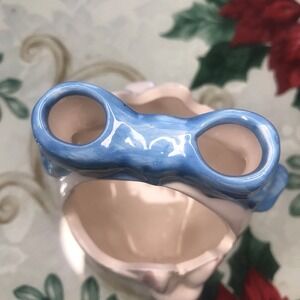 Ceramic basket-shaped decorative container featuring two bunnies facing opposite directions. Bunnies are white with pale blue bow at top and green grass along the bottom of container. Perfect for trinkets or candy for Easter or spring-time use
