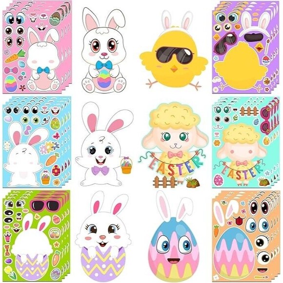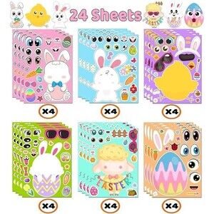 * [Easter DIY Sticker]: Easter basket fillers. The Easter toy set comes with 24 sheets of make-your-own Easter stickers in 6 different styles, 4 sheets of each style, including a variety of cute facial expressions for DIY. Sufficient quantity, bright colors and various styles to meet your various Easter decoration needs.