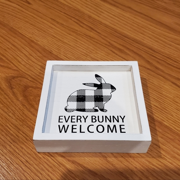 Hobby Lobby wood black and white Easter decor sign with a plaid bunny that says "Every Bunny Welcome" - measures 5"×5" - for decorative use only - smoke free home