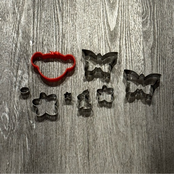 Set of kid-friendly cookie and craft cutters in red and silver. Includes butterfly and flower shapes for baking and play. Easy-to-use design that encourages creativity and hands-on fun. Features a bright red cutter paired with stainless silver shapes.