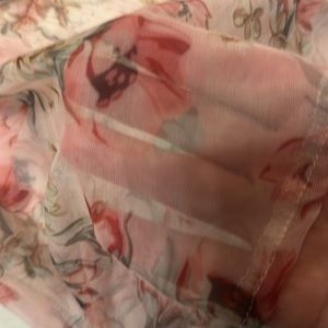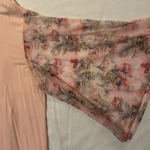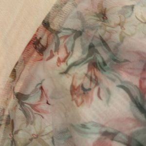 Lightweight Easter blouse sleeves are transparent. The sleeves have pink, green, dark green and mauve flowers.