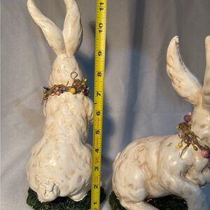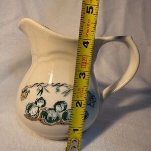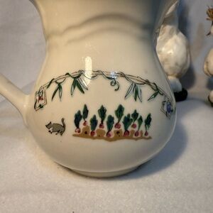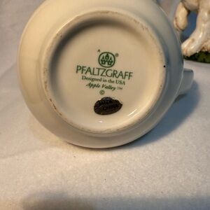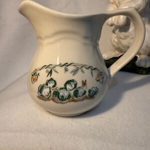 Pfaltzgraff Apple Valley ceramic cream pitcher with sweet graphics. Beautiful large Easter bunny duo included. Smaller bunny has small amount of damage to nose and large bunny has small area of damage to “grass” on one side.
