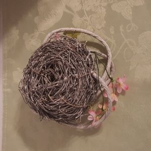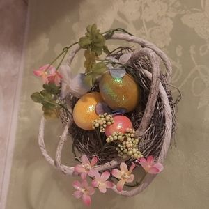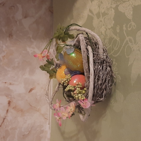 Moss basket with faux wood and flowers interwoven into a basket shape and a couple Easter eggs