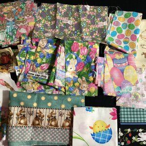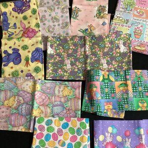 There are 20 fat quarters. 9 different are shown in photo 2. Five different styles are in photo 3, each has 2 fats but one has 3, making 11 to equal 20 fats in all. Photo 3 shows 2 larger fat quarters 17x26 and 18 x31. Scrap bag is shown in the last photo. This is a large bag including many pieces. Some smaller pieces (6-3x3"squares, 2 1/2" strips) and larger pieces (5x18, 8x17, 10x22). Total 6 1/2 to 7 yards. 100% cotton. Under 2 pounds, can be bundled.