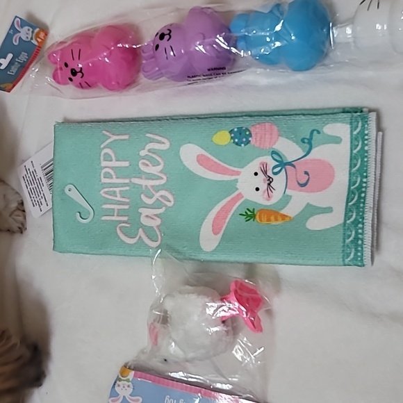Easter hand towel, L 23' W 15'. plastic easter eggs, hopping toy for easter basket.