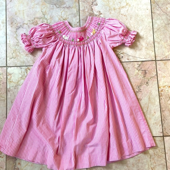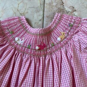 Adorable pink check smock dress Easter theme, green and pink stitching. Excellent condition