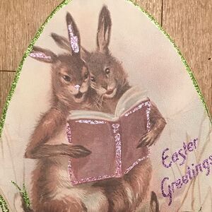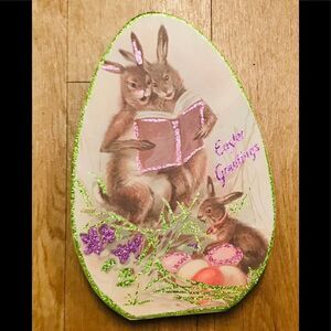 A giant wood Easter egg had rabbit parents read to their child sitting on Easter eggs.