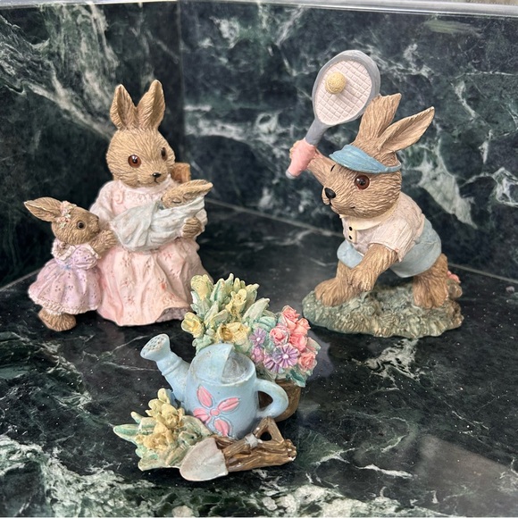Brighten up your holiday season with this delightful pink and blue decor pieces: tennis player bunny, bunny family, and watering can with flowers. 1993