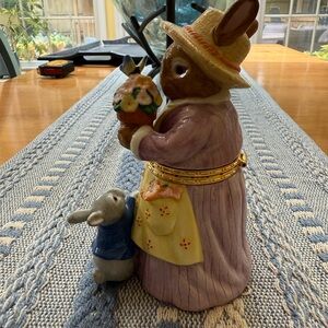 Description: This charming porcelain trinket box features a mother rabbit in a straw hat and apron, surrounded by flowers, with a baby rabbit watering a plant. It is designed to hold small items like jewelry or other trinkets.