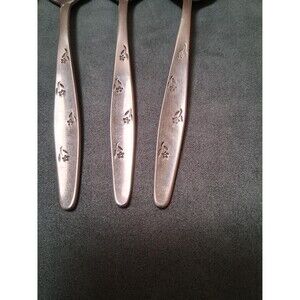 Four nice Easterling Tuscan Ware Floret pattern soup/ place spoons. Pretty impressed floral design tinted black in stainless steel. Theyre in great vintage condition with minor expected wear commensurate with normal use.