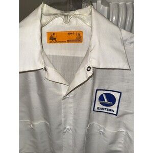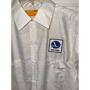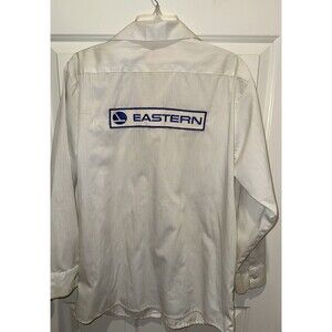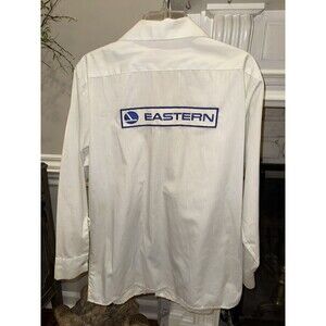 The product is a vintage Eastern Airlines machinist work shirt in size large. It is a rare collectible item featuring the Eastern Air Lines logo and is designed for men. The shirt is not modified and is an authentic piece from Eastern Airlines.