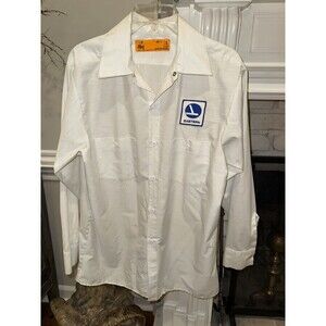 Authentic former employee work shirt. Large regular. This has been worn and has a few spots on the front. There is soiling on the cuff edges from age.