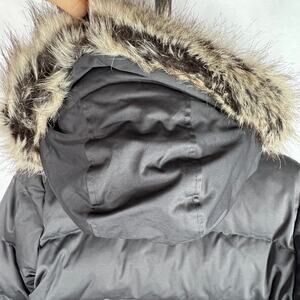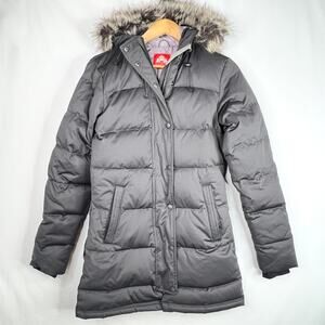 Like new worn once EMS Eastern Mountain Sports dark grey puff style winter jacket with hood with removable faux fur trim. 100% polyester. Super warm. Zipper and snap front closure and adjustable waist. Size extra small women's.