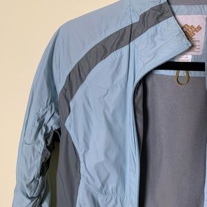 Eastern mountain sports blue and gray windbreaker jacket size extra small used but in good condition