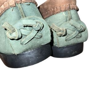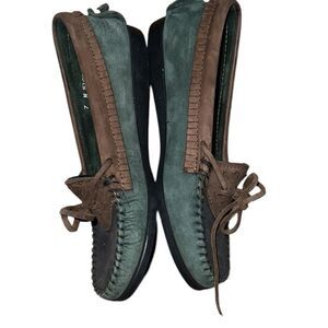 These Eastland moccasins feature a soft suede exterior in rich brown and green tones, designed for ultimate comfort and casual wear. The distinctive moccasin-style toe is accented with visible stitching and a decorative lace detail, adding a touch of elegance to the relaxed design. Good preowned condition. Minor signs of wear.