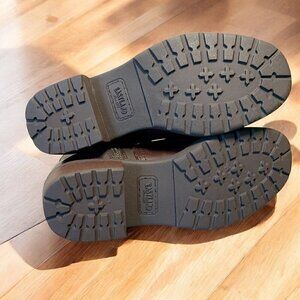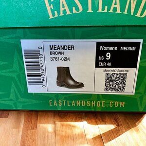 Brand new in the box, Eastland Meander ankle boot in glossy dark brown leather and brown nubuck with interior side zipper and stacked 1.5" heel. Women's size 9. Runs a little narrow. Perfect for the change in seasons.Looks great with jeans or paired with a maxi skirt for that Boho Western look. Arch support for all day comfort.