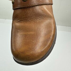 Eastland Gabriella women’s US 7.5. These daily slip-on backless clog mules have a solid leather brown upper, accent grommet detail, elastic gore stretch technology, cushioned comfortable footbed, traction patterned outsole, block small heel and round toe. Materials made in China, leather upper, fabric insole, EVA sole. Condition is preloved good with minor wear to vamps, minor wear to the toe-bed, average wear to the footbed, minor wear to back of heels, average wear to outsoles all as shown in pictures. Please preview the measurements to ensure fit.