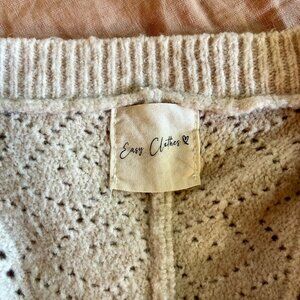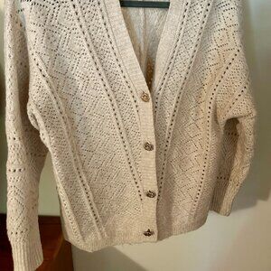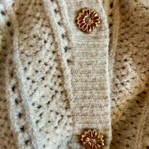 Cozy knit cardigan from Easy Clothes, size Large. Features a diamond lace-pattern knit, ribbed trim, and standout gold floral statement buttons. Soft cream tone adds a feminine and vintage-inspired touch, perfect for layering over dresses or pairing with high-waisted denim. Excellent pre-loved condition with no visible flaws.