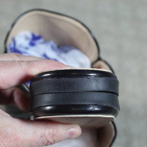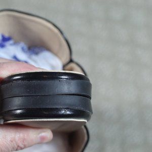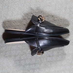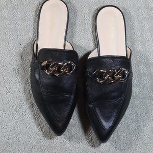 Stylish, elegant and upscale black slide-on flats by Easy Smile. The heavy gold-toned chain adds a lux feel. Excellent preowned condition - LIKE NEW.
