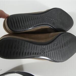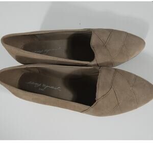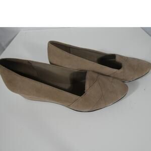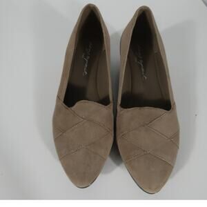 Size 7 slip on dress shoe in a taupe suede. A little heal and a pointed toe.