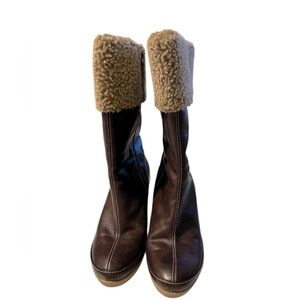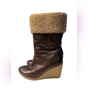 The Easy Spirit Mid-Calf Wedge Boots in Nerinet, size 8.5 M, are stylish and comfortable women's boots perfect for casual occasions. Made of brown leather with an almond toe shape and high wedge heel, these boots feature a zip closure and faux fur lining for added luxury. The shearling style accents and zipper accents add a trendy touch to the overall design. Easy Spirit's reputation for quality and comfort is evident in these mid-calf wedge boots, making them a versatile and fashionable choice for any wardrobe.