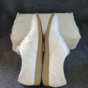 The Easy Spirit Motion White Leather athletic shoes in size 8.5 feature a lace-up closure and a low-top style with a rubber outsole for comfort and stability. The white leather upper material and terry fabric lining offer a sleek and stylish look. Designed for various activities including cross-training, boxing, and cycling, these shoes provide minimal cushioning for an active lifestyle. Perfect for all seasons, these shoes are part of the Easy Spirit Anti-Gravity product line, promoting a sense of lightness and ease with every step.